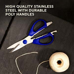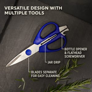 This two piece blue kitchen shear set provides you with a modern style to fit in any kitchen with endless uses and functions. The soft grip plastic casing provides a comfortable hold and reduces hand fatigue. while the equipment opener/grasper makes it easy to crack nuts. twist open stubborn jar lids. or strip and remove fresh herbs from tough stems.